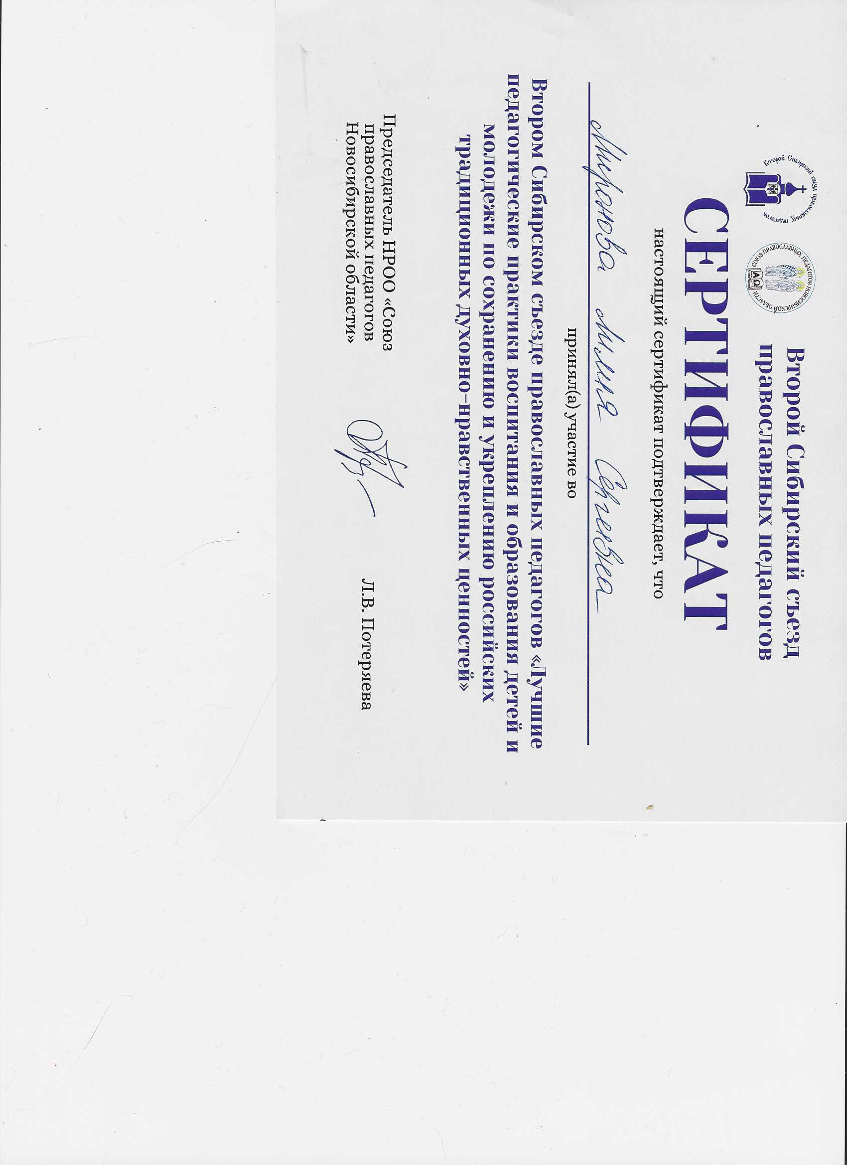 Сертификат подтверждающий участие во Втором Сибирском съезде православных педагогов "Лучшие педагогические практики воспитания и образования детей и молодежи по сохранению и укреплению российских традиционных духовно-нравственных ценностей" 2025г.